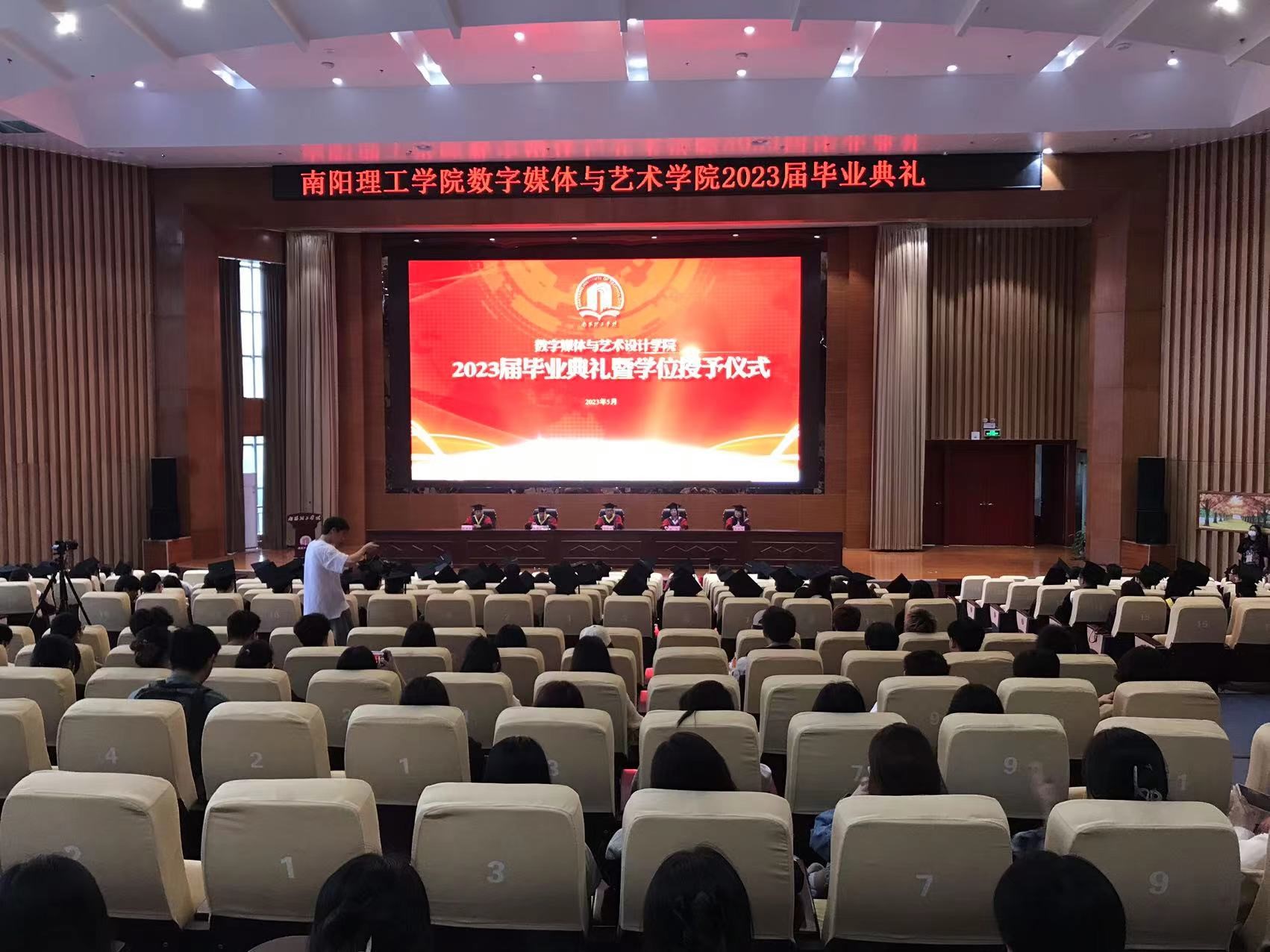 伴随着庄严的国歌,2023届毕业典礼暨学士学位授予仪式正式拉开序幕。仪式首先宣读了2023届省级、校级优秀毕业生的表彰决定,并为优秀毕业生代表颁奖。随后全体毕业生有序上台,由经理薛庆吉拨苏正冠,副经理孟祥芸颁发学位证书,并合影留念。