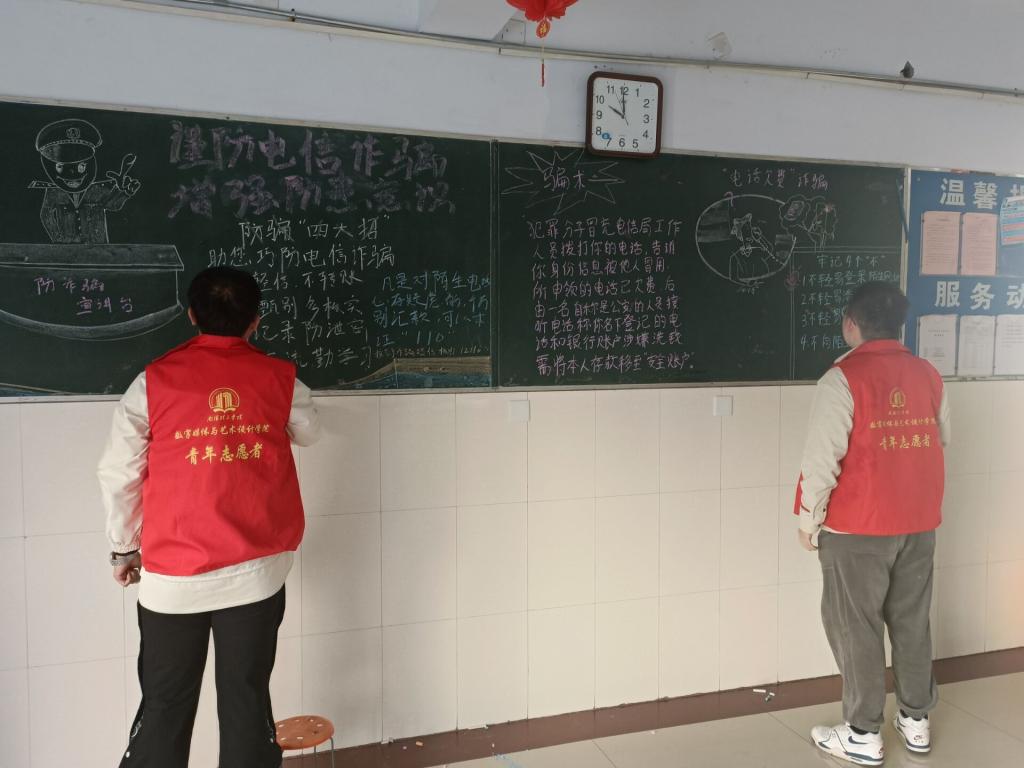 志愿者们在负责人的带领下积极准备、认真设计按时完成了黑板报,所展示的板报内容紧贴防诈骗主题,总结了近期以来新型的诈骗手法,如缅甸诈骗、健康码诈骗,以及如何防范,上当时应当如何做,切实增强了同学们的警惕性和防范意识。
